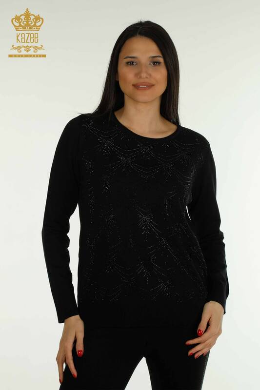 Hurtownia Sweterów Damskich Z Długim Rękawem Z Kamieniami Haftowanymi Czarnymi - 30635 | KAZEE