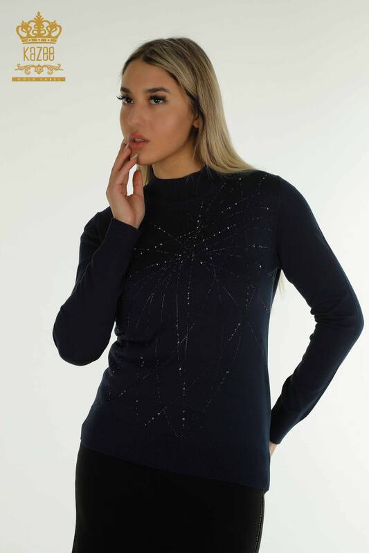 Hurtownia Sweterów Damskich z Dzianiny Wysokim Kołnierzykiem Kamieni Haftowane Długim Rękawem Granatowy - 30454 | KAZEE