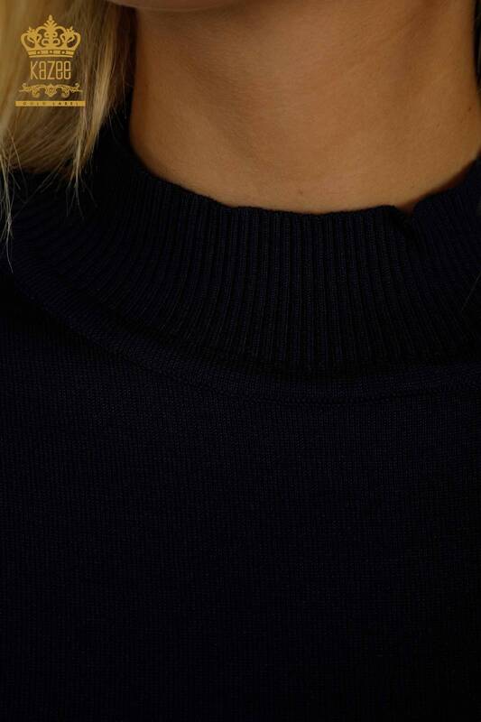 Hurtownia Swetra Damskiego Z Dzianiną Wysokim Kołnierzem Podstawowym Z Logo Granatowy - 30613 | KAZEE