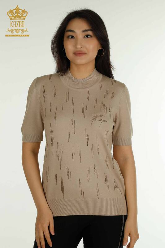 Hurtownia Sweterów Damskich Sweterów Ze Staja Kołnierzykiem Kamiennym Haftowanym Krótkim Rękawem Beżowy - 30599 | KAZEE