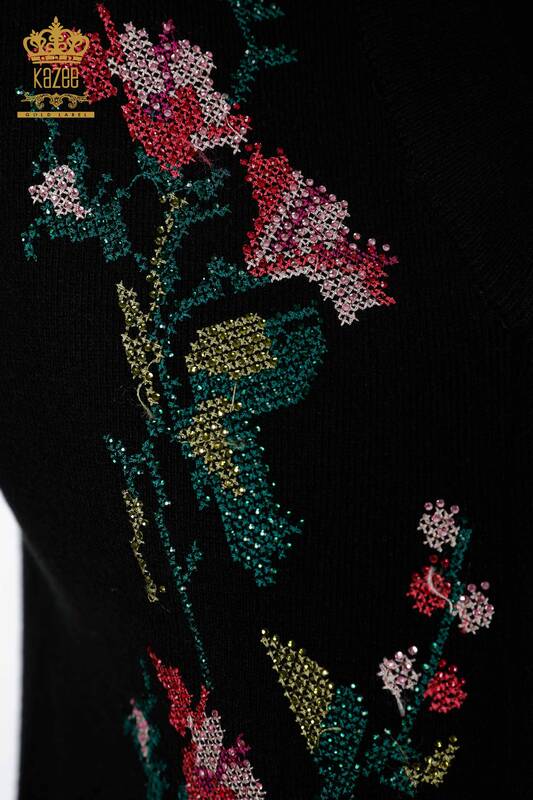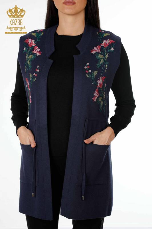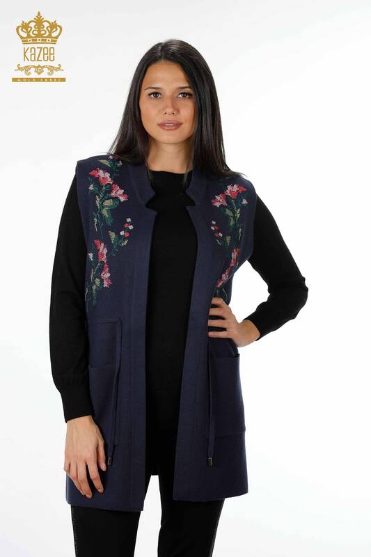 Hurtownia damska dzianinowa kamizelka z kolorową haftowaną kieszenią w kwiaty, długa - 16844 | KAZEE
