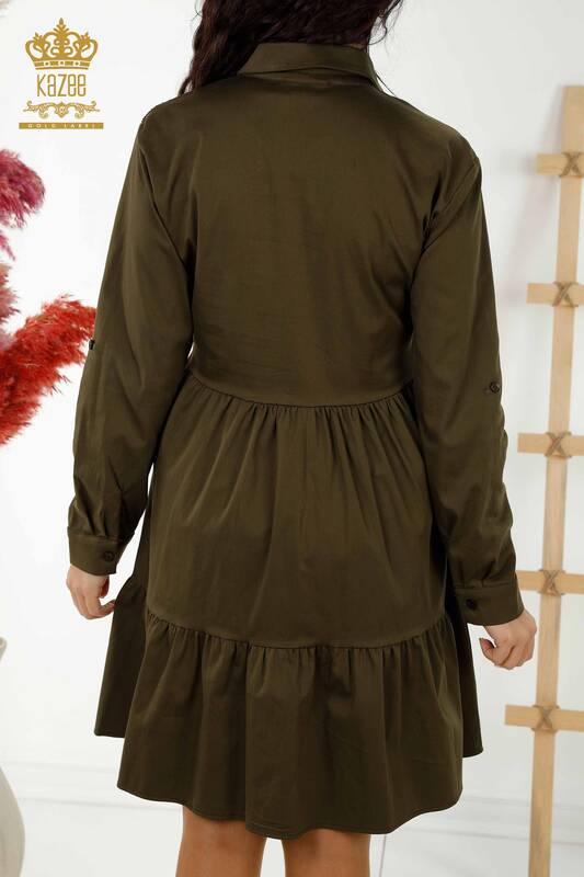 Hurtownia sukienek damskich zapinana na guziki z kryształowym kamieniem haftowanym Khaki - 20229 | KAZEE