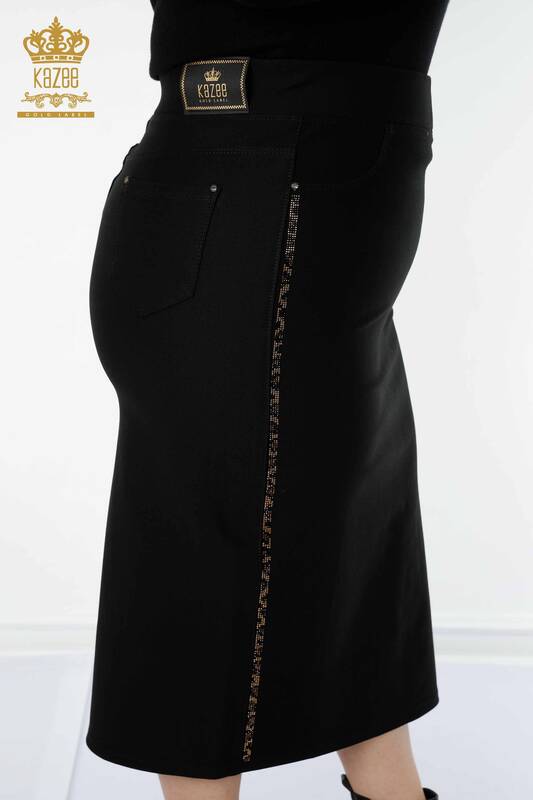 Hurtownia spódnicy damskiej w panterkę w paski z kamieniem, haftowaną szczeliną, szczegółową kieszenią, czarna - 4209 | KAZEE