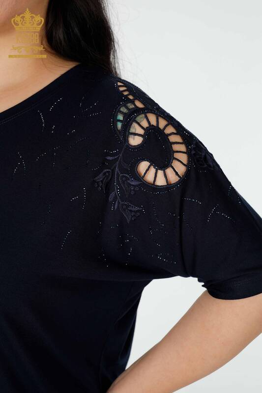 Camicetta da donna all'ingrosso spalla dettagliata pietra ricamata blu navy - 77985 | KAZEE