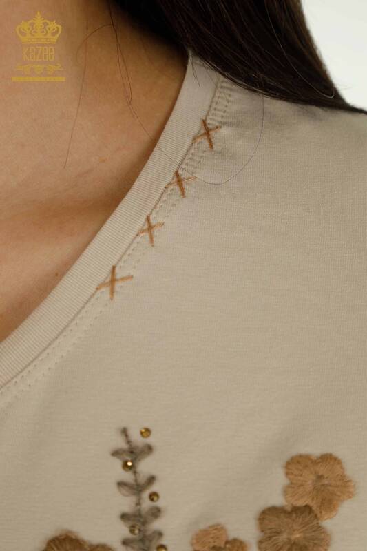 Vendita all'ingrosso Camicetta da donna con scollo a V ricamato con pietre ricamate floreali beige chiaro - 79466 | KAZEE