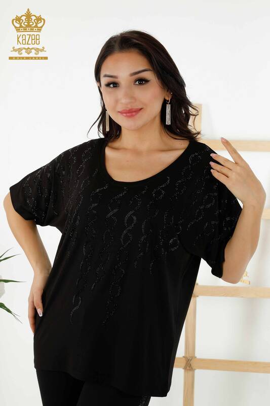 Camicetta da donna all'ingrosso Crystal Stone motivo ricamato nero - 79069 | KAZEE