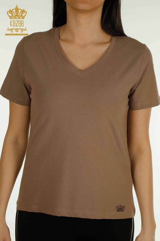 Vendita all'ingrosso Camicetta da donna manica corta pietra ricamata scollo a V marrone chiaro - 79561 | KAZEE