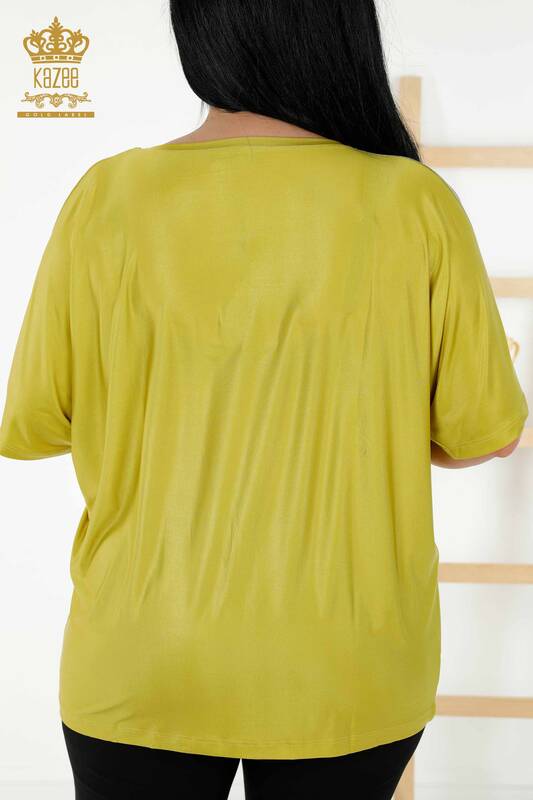Camicetta da donna all'ingrosso motivo floreale pietra ricamata manica corta verde pistacchio - 77802 | KAZEE