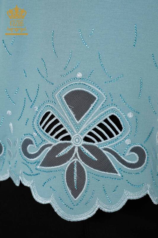 Camicetta da donna all'ingrosso con scollo a V dettagliato in tulle ricamato in pietra blu - 77927 | KAZEE