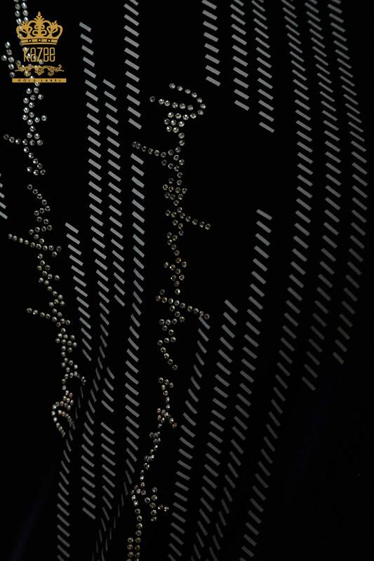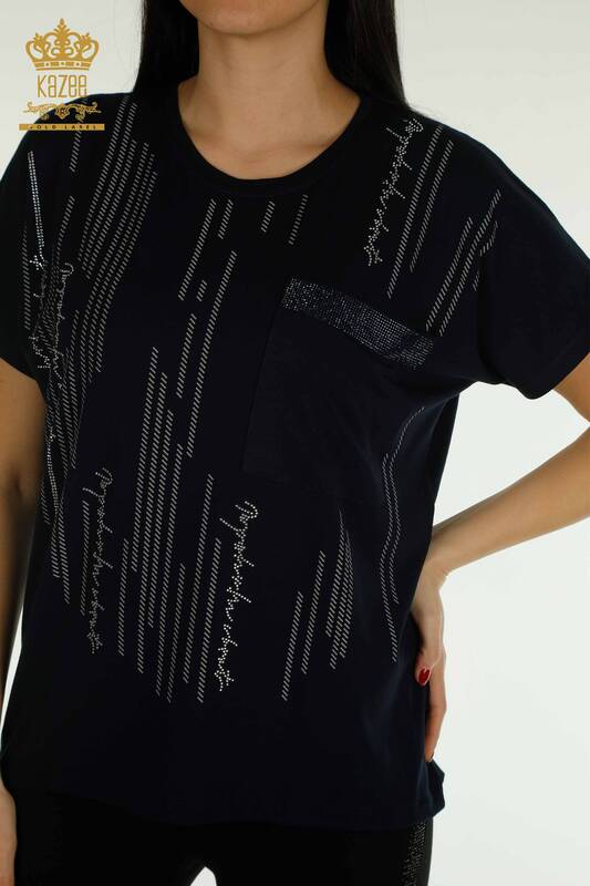 Camicetta da donna all'ingrosso con tasca dettagliata in pietra ricamata blu navy - 79140 | KAZEE