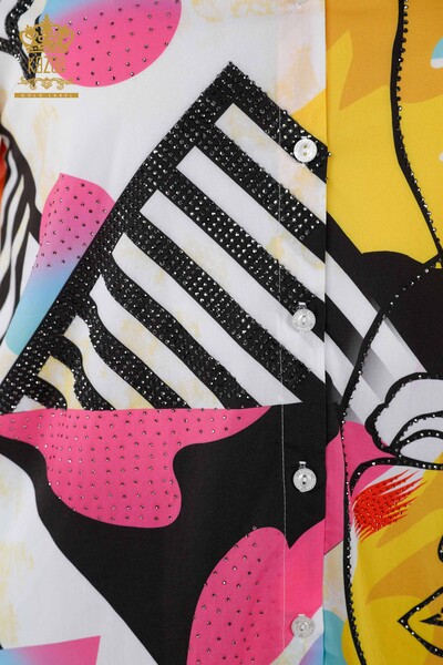 Camicia da donna all'ingrosso con stampa digitale ricamata in pietra - 20358 | KAZEE