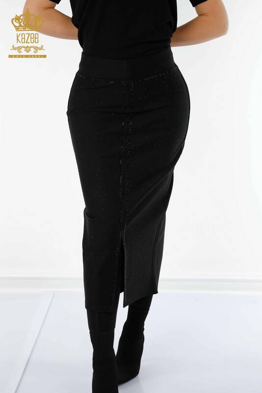 Vendita all'ingrosso Gonna da Donna Lunga Pietra Ricamata Dettaglio Spacco Nero - 4192 | KAZEE
