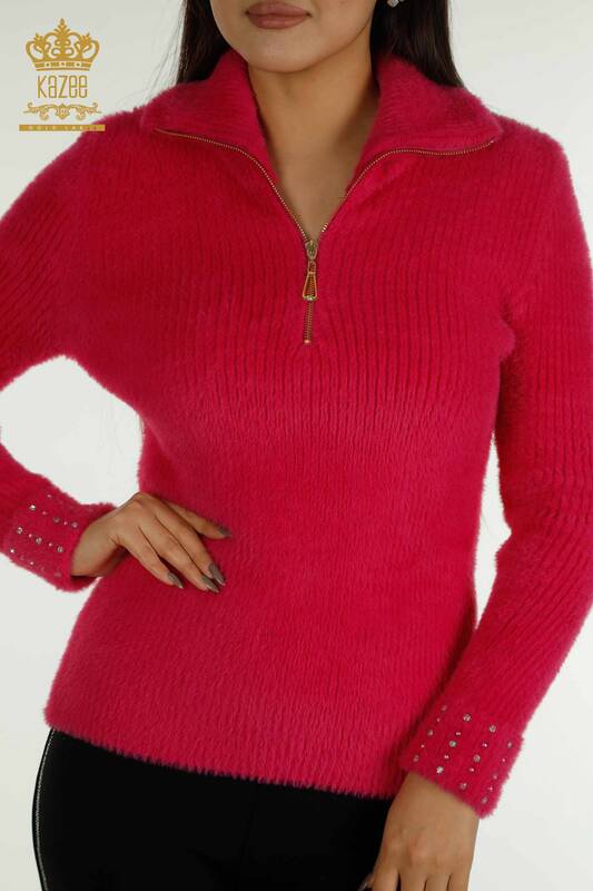 Maglieria da donna all'ingrosso pietra d'angora con perline cerniera fucsia - 30769 | KAZEE