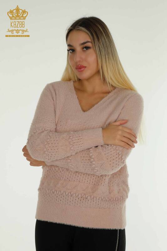 Vendita all'ingrosso Maglieria da donna Maglione Angora Scollo a V Traforato Polvere - 30697 | KAZEE