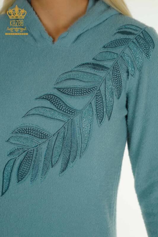 Maglieria da donna all'ingrosso maglione con cappuccio foglia d'angora ricamata pietra menta - 40008 | KAZEE