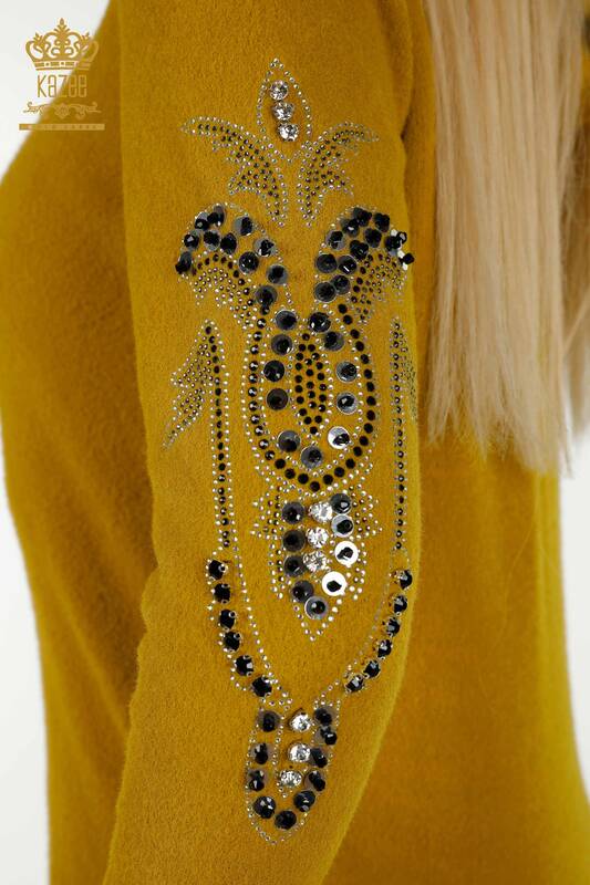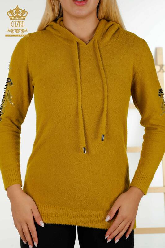 Vendita all'ingrosso Maglieria da donna Maglione con maniche con cappuccio Senape ricamato con pietre dettagliate - 40006 | KAZEE