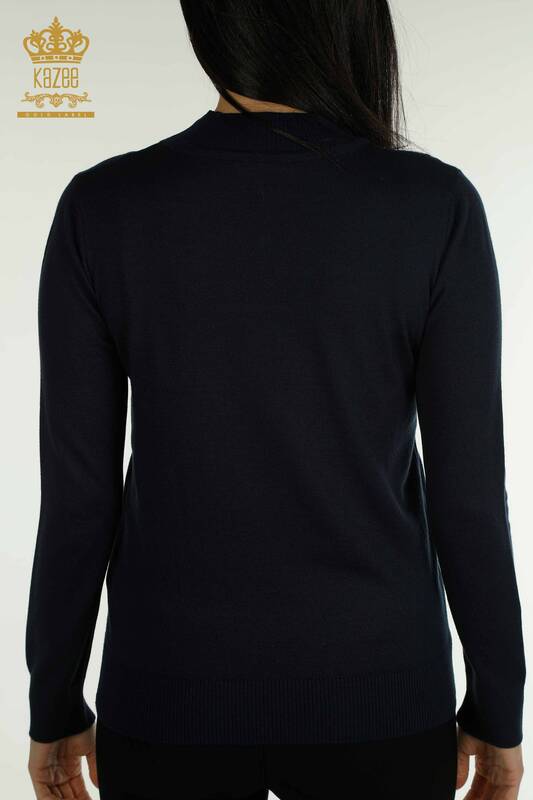 Vendita all'ingrosso Maglieria da donna maglione colletto rialzato ricamato in pietra di cristallo blu navy - 30469 | KAZEE