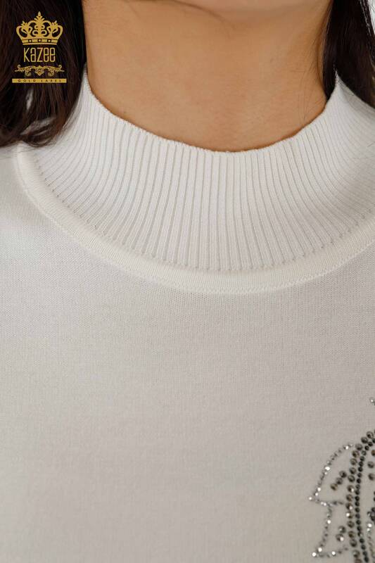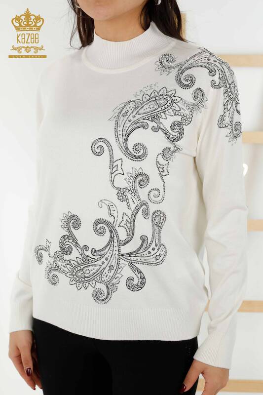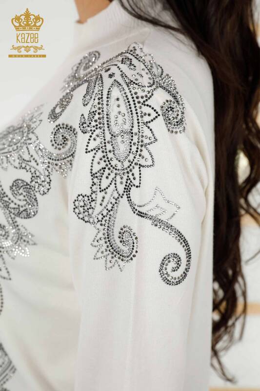 Maglieria Donna all'Ingrosso Maglione Fantasia Crystal Stone Ricamato Ecru - 30013 | KAZEE
