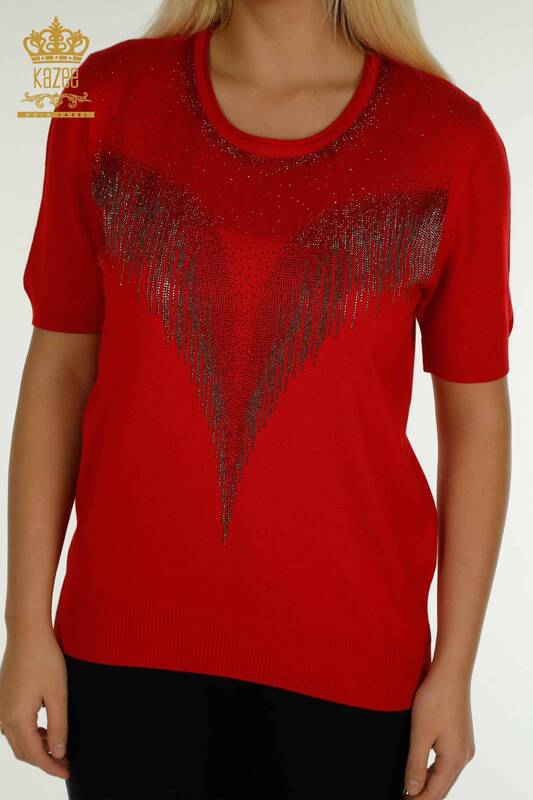 Maglieria da donna all'ingrosso maglione con pietre di cristallo ricamate modello americano rosso - 30330 | KAZEE