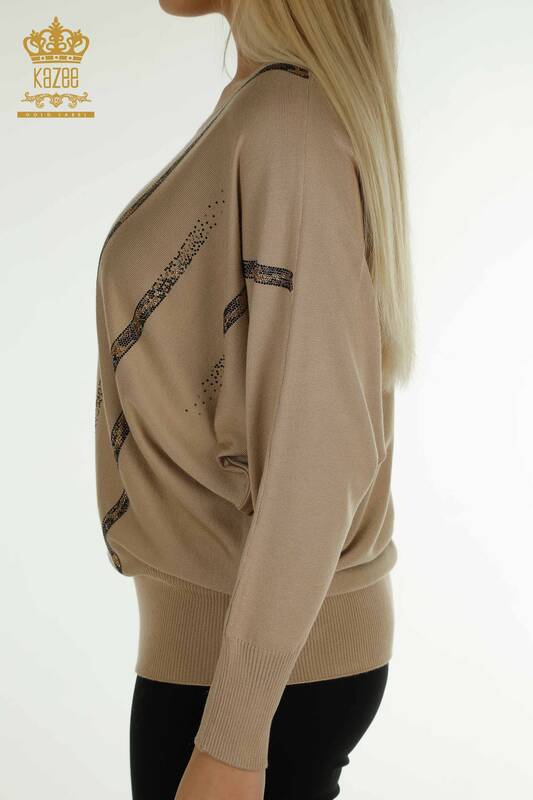 Maglieria da donna all'ingrosso Maglione con maniche a pipistrello ricamate in pietra leopardata beige - 30633 | KAZEE