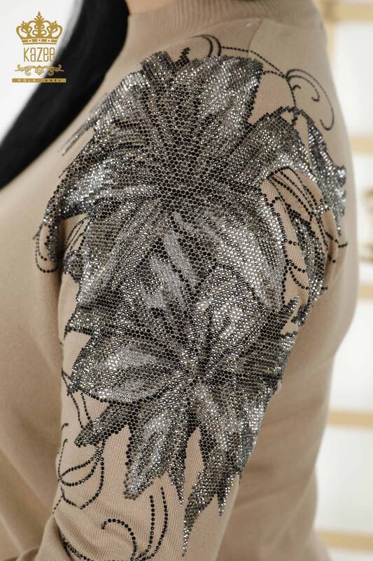 Commercio all'ingrosso Maglieria Donna Maglione Spalla Fiore Dettagliato Pietra Ricamato Beige - 16597 | KAZEE