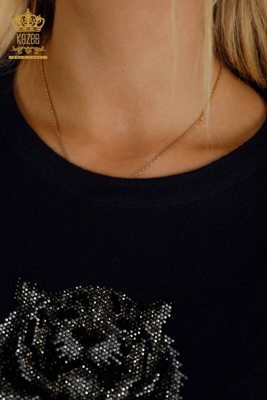 Maglieria da donna all'ingrosso maglione modello tigre pietra ricamata blu navy - 30127 | KAZEE
