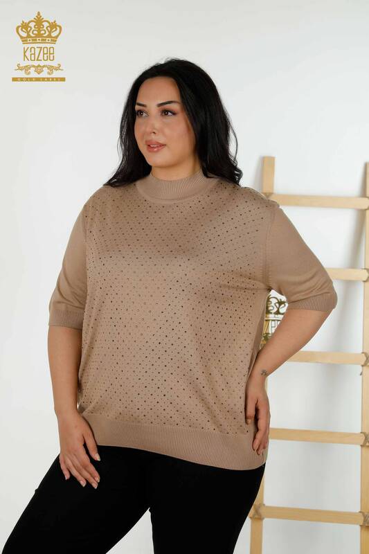 Maglieria Maglieria Donna all'Ingrosso Manica Corta Pietra Ricamata Beige - 16950 | KAZEE