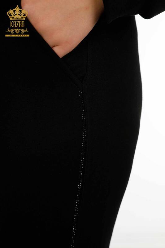 Set di tute da donna all'ingrosso nero con cerniera con cappuccio ricamato in pietra - 20414 | KAZEE
