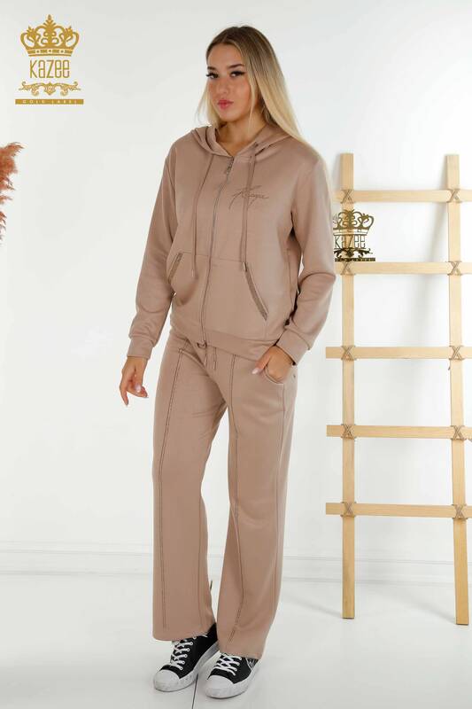Vendita all'ingrosso Set di tute da donna con tasca in visone con cappuccio ricamato in pietra - 17598 | KAZEE