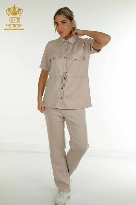 Vendita all'ingrosso Set di tute triple da donna con tasca dettagliata e maniche corte in visone - 17633 | KAZEE