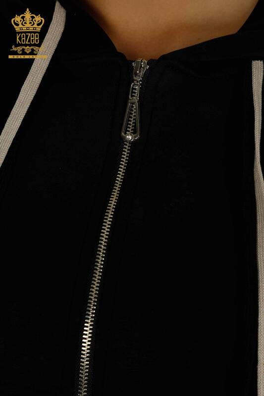 Vendita all'ingrosso Set di tute triple da donna con cerniera e cappuccio in pietra ricamata nera - 17616 | KAZEE