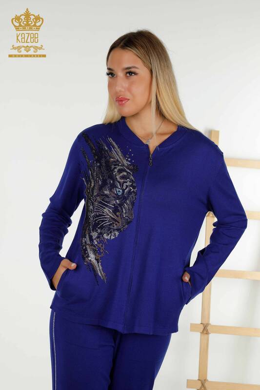 Set di tute da donna all'ingrosso Saks ricamati in pietra con cerniera e fantasia leopardata - 16660 | KAZEE
