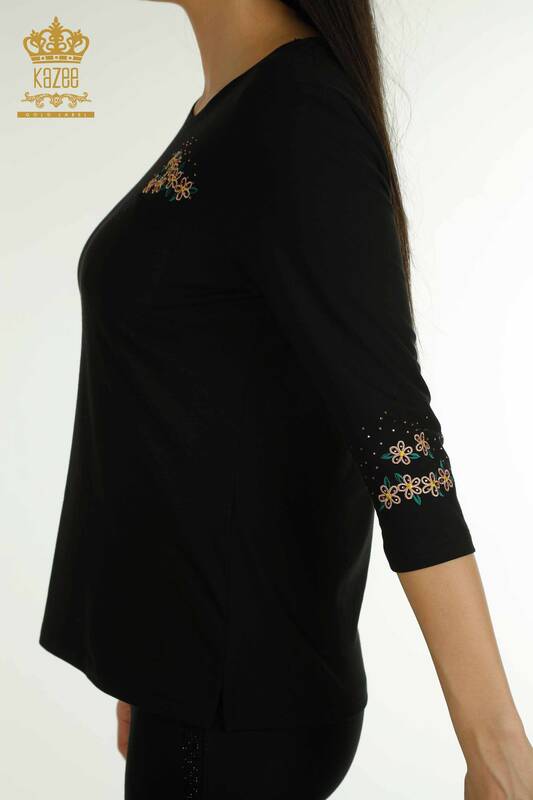 الجملة بلوزة نسائية جيب مفصلة نمط الأزهار حجر مطرز أسود - 79477 | كازي
