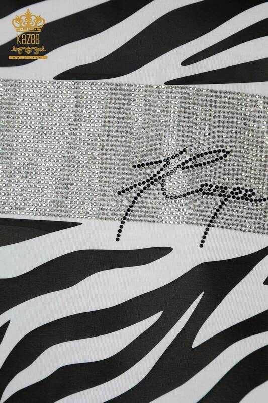 الجملة بلوزة نسائية حمار وحشي مخطط حجر مطرز كم قصير أبيض - 79457 | كازي