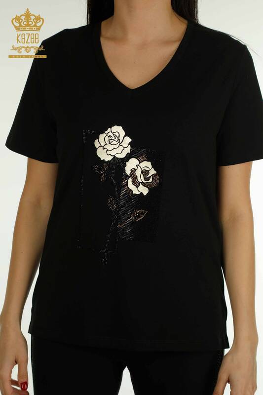 الجملة المرأة بلوزة زهرة مطرزة حجر مطرز كم قصير أسود - 79860 | كازي