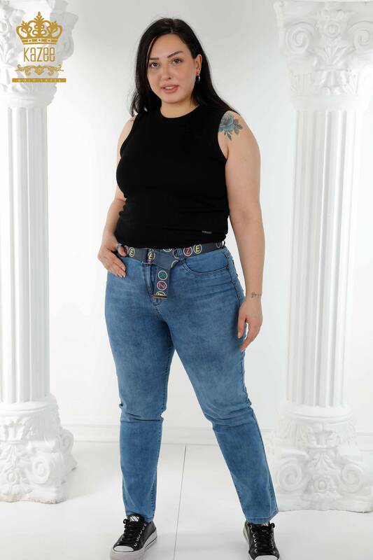 بنطلون جينز نسائي مع حزام مطرز باللون الأزرق - 3681 | كازي