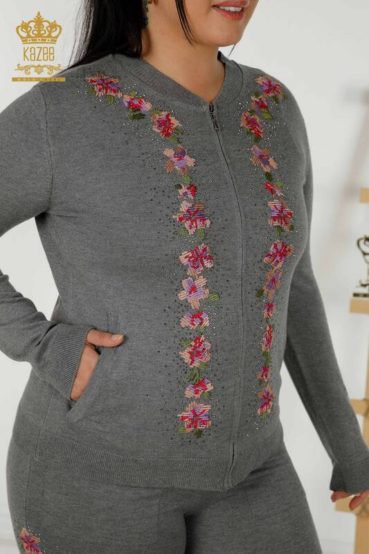 بدلة رياضية نسائية - بنقشة زهور مطرزة باللون الرمادي - 16658 | كازي