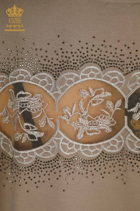 بلوزة نسائية بالجملة بأكمام قصيرة مطرزة بأحجار تول مفصلة مينك - 79302 | كازي