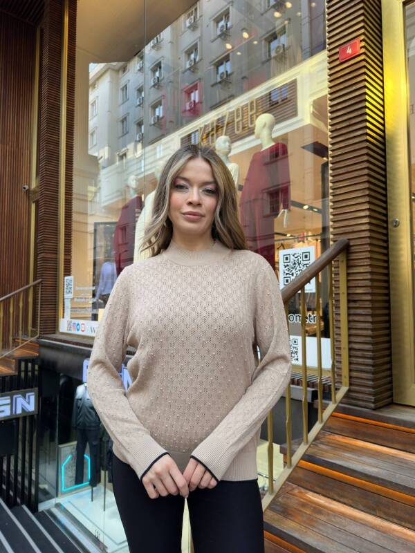 كنزة صوفية محبوكة، بياقة عالية، منقوشة، بيج - 32101 | كازي (طقم من 3 قطع M-L-XL)