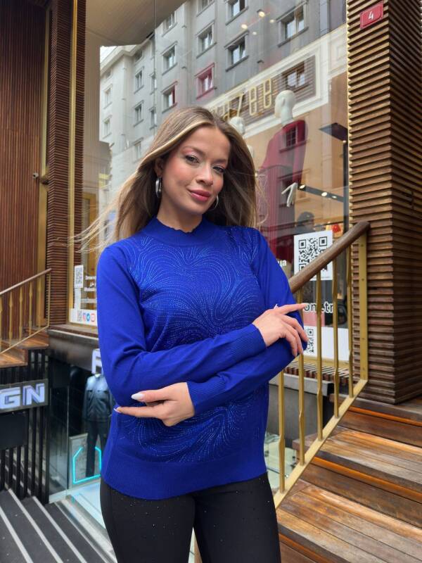 كنزة صوفية مزينة بأحجار، بياقة عالية، لون كحلي - 32065 | كازي (طقم من 3 قطع، مقاسات L-XL-2XL)