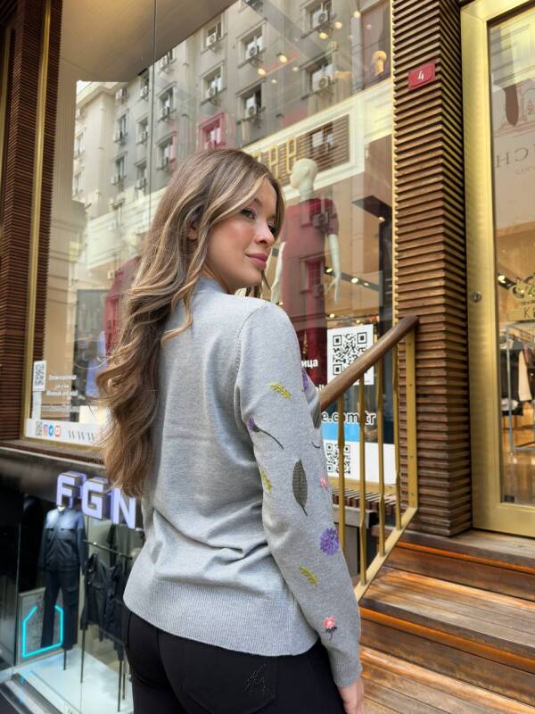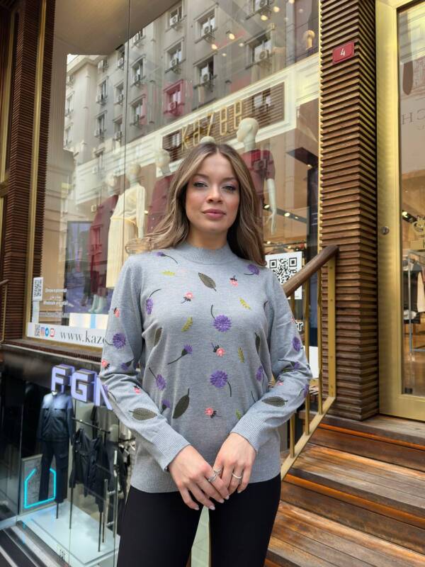كنزة صوفية محبوكة بتطريز زهري، رمادي - 32166 | كازي (طقم من 3 قطع، مقاسات L-XL-2XL)
