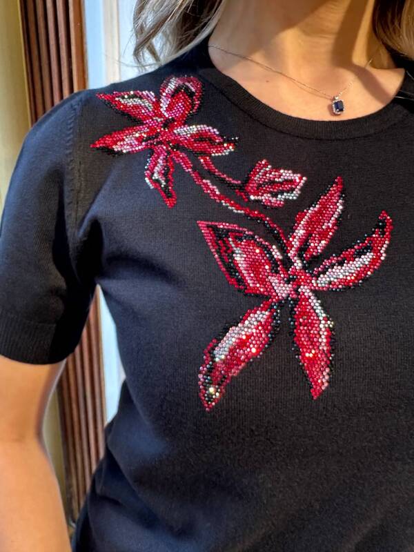 كنزة صوفية محبوكة مزينة بأحجار، بياقة دائرية، أسود - 31051 | كازي (طقم من 3 قطع S-M-L)