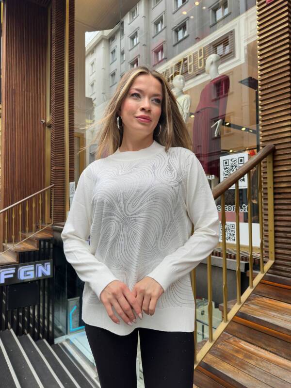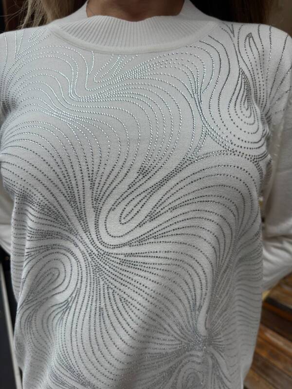 كنزة صوفية محبوكة مزينة بأحجار، بياقة عالية، لون بيج فاتح - 32065 | كازي (طقم من 3 قطع، مقاسات L-XL-2XL)