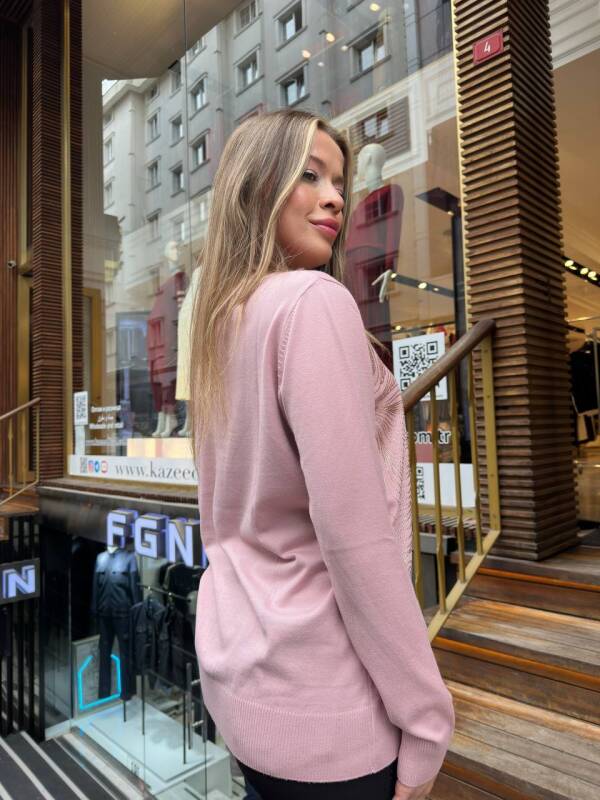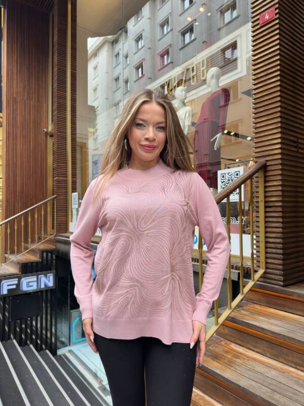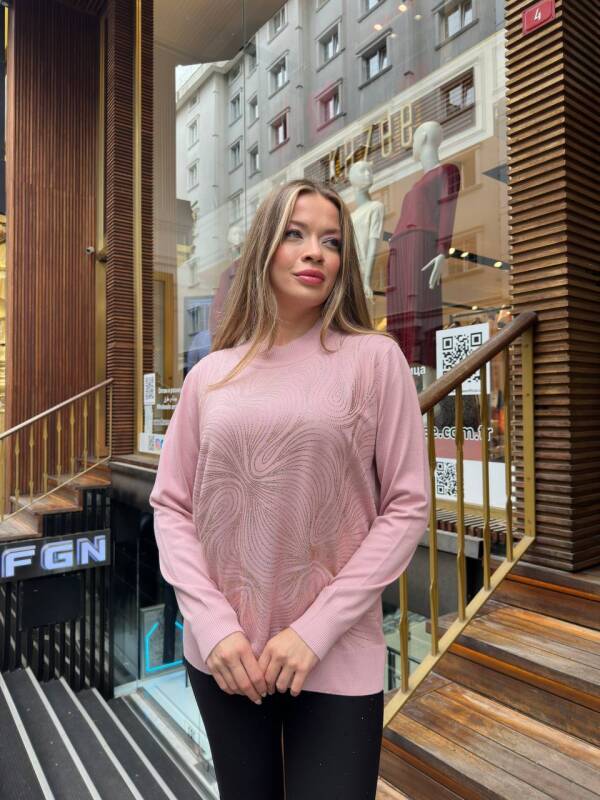 كنزة صوفية مزينة بأحجار، بياقة عالية، لون وردي فاتح - 32065 | كازي (طقم من 3 قطع، مقاسات L-XL-2XL)