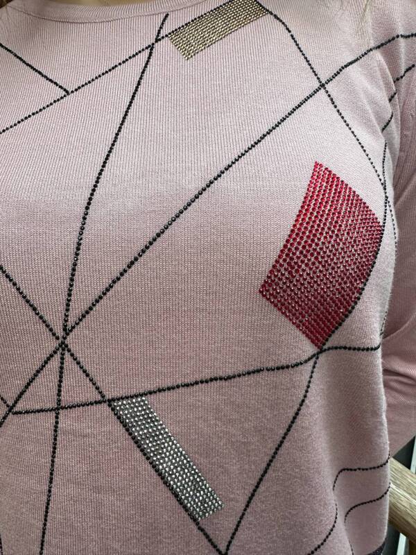 كنزة صوفية محبوكة بياقة دائرية، مزينة بأحجار، لون وردي فاتح - 31874 | كازي (طقم من 3 قطع، مقاسات XL-2XL-3XL)