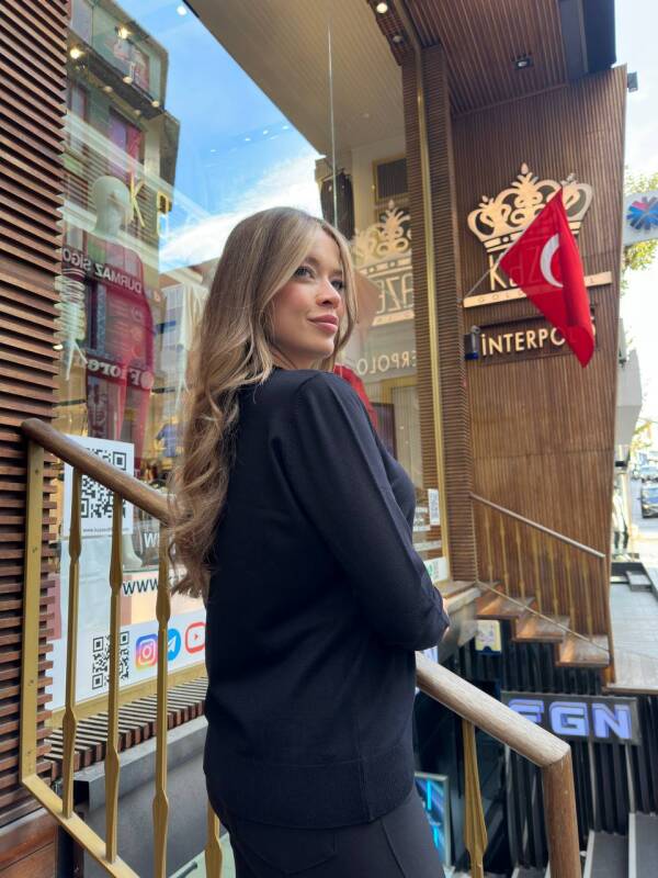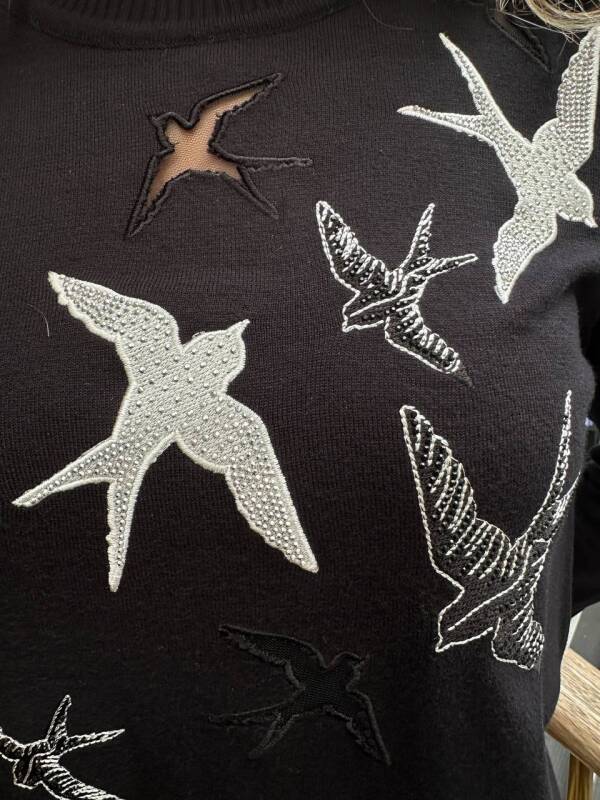 كنزة صوفية محبوكة بنقشة طيور وتطريزات حجرية، أسود - 31064 | كازي (طقم من 3 قطع، مقاسات M-L-XL)