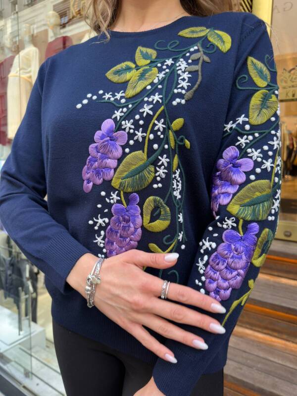 كنزة صوفية محبوكة برقبة دائرية وتطريز زهري، لون كحلي - 32253 | كازي (طقم من 3 قطع، مقاسات L-XL-2XL)