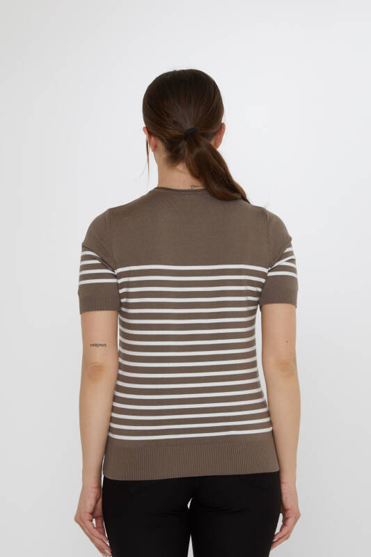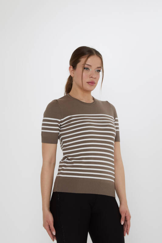 كنزة صوفية مخططة بأكمام قصيرة، لون مينك-إيكرو - 30396 | كازي (طقم من 4 قطع: M-L-XL-2XL)