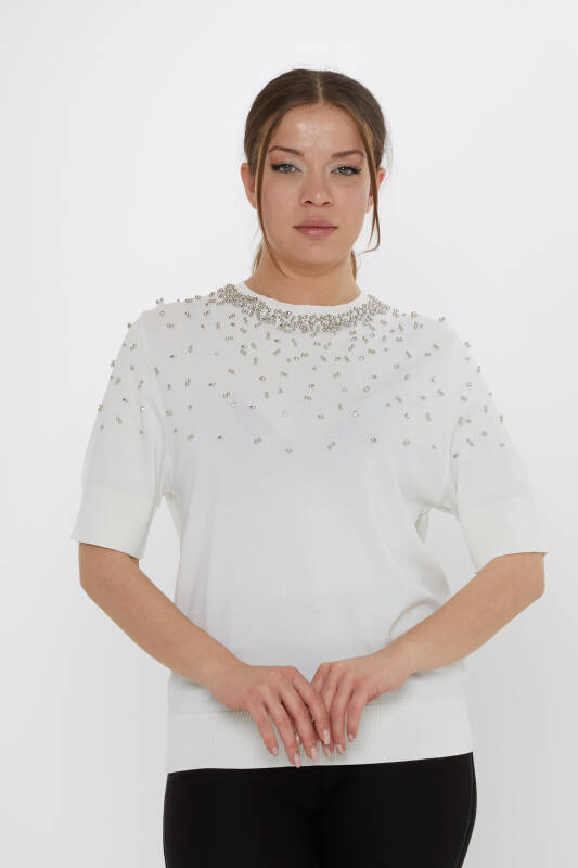 Beaded Knit Sweater, Short Sleeves, Ecru - 31805 | KAZEE (3-Piece Set S-M-L)
