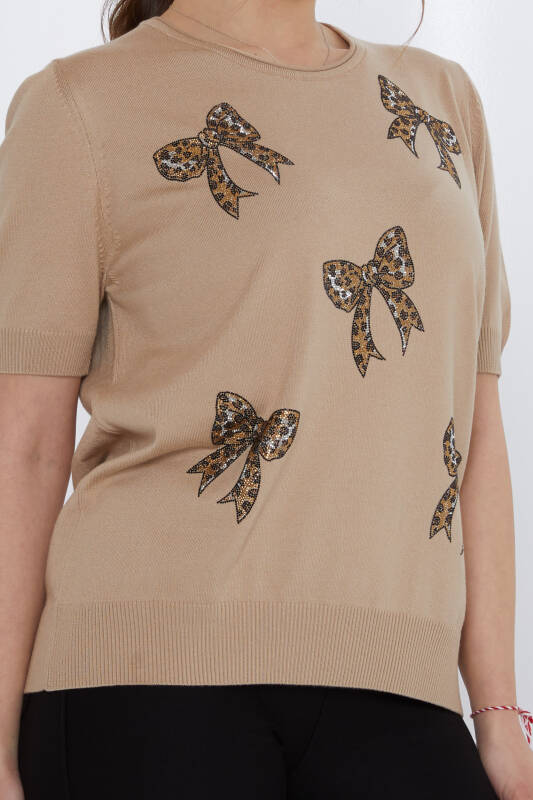 Knitted Sweater Bow Stone Embroidered Short Sleeve Beige - 31577 | KAZEE (Set of 3 XL-2XL-3XL)